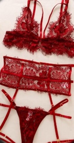 Soft 5 piece burgundy, frayed lace suspender intimate set. Comes with adjustable strap