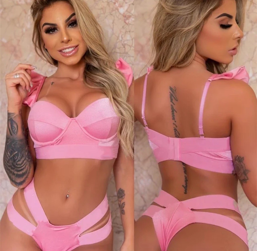 Sporty pink padded frilly bra & a broad sexy double strap G-string set.
